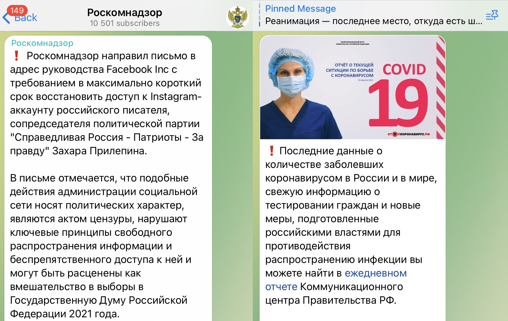 Однако Telegram продолжал работать. Даже у государственных ведомств были официальные каналы, например «СТОПКОРОНАВИРУС.РФ» от Министерства Здравоохранения, «Роскомнадзор» от Федеральной службы по надзору в сфере связи, информационных технологий и массовых коммуникаций.