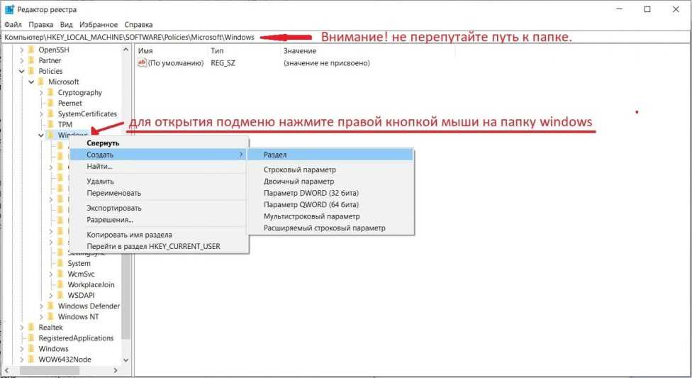 3. Перейдите по следующему пути: Компьютер > HKEY_LOCAL_MACHINE > SOFTWARE > Policies > Microsoft > Windows; 4. Щелкните правой кнопкой мыши кнопку Windows (папка), выберите подменю «Создать», а затем выберите параметр «Раздел»;