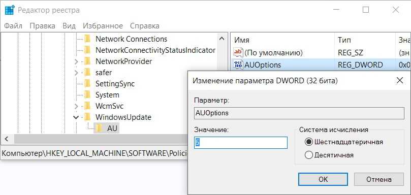 9. Назовите новый раздел AUOptions и нажмите Enter; 10. Дважды щелкните на AUOptions и измените его значение (любое число, значения смотрите ниже):