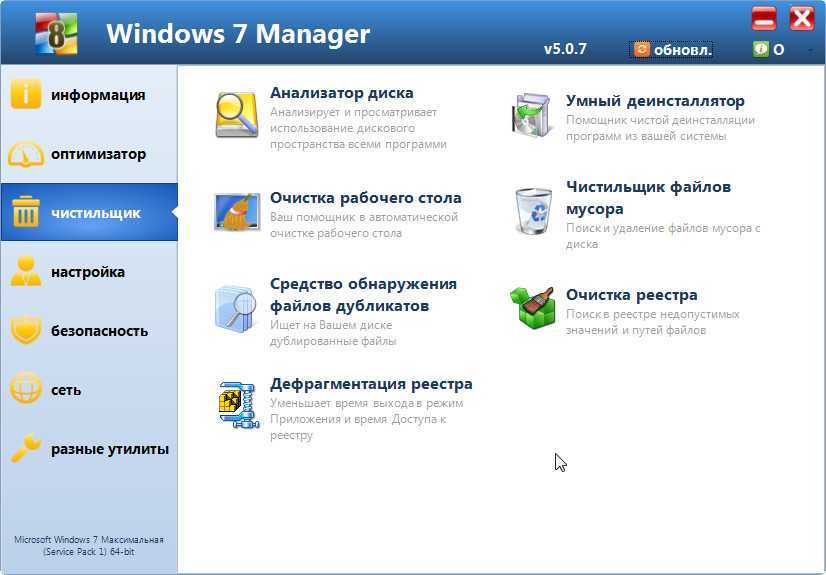 Утилита Windows 7 Manager позволяет проводить полноценное обслуживание операционной системы. Скачать ПО можно здесь.