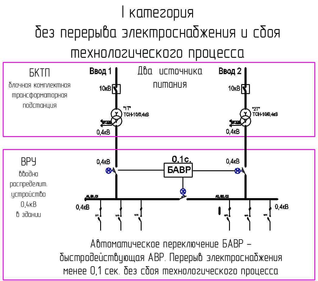 Время перерыва электроснабжения в этом случае минимально. Оно обусловлено временем срабатывания автоматической системой переключения, и не должно превышать норматив 0,5-0,7 сек.