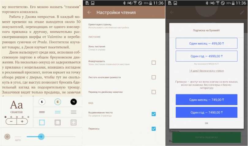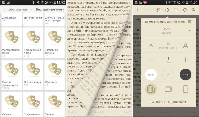 Настроек у читалки не так много, но всё основное присутствует. К сожалению, читать можно только книги из каталога, чтение файлов из памяти приложение не поддерживает. В остальном же – очень рекомендуется, если вы хотите попробовать что-то новое.