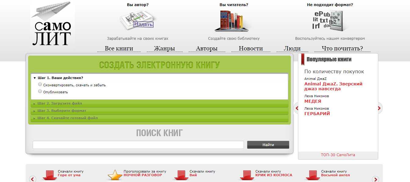 Этот сервис особенен тем, что с него можно не только скачивать бесплатно материалы, но и загружать туда свои работы, и даже зарабатывать на этом. Создатели ресурса подарили молодым писателям прекрасную возможность продемонстрировать свои навыки и обеспечить широкий доступ к своим трудам. Здесь можно найти файлы в формате fb2, epub, txt. Для удобства читателей прямо на сайте размещен конвертер, адаптирующий имеющиеся файлы под альтернативные устройства. Еще одна полезная опция – возможность создавать собственные виртуальные библиотеки.