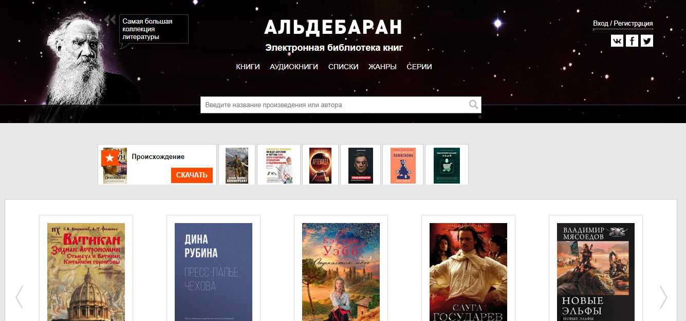 Огромная электронная библиотека, в фонде которой насчитывается порядка 200 000 книг. Для использования сервиса не нужно регистрироваться или скачивать приложение: все книги доступны сразу и без каких-либо ограничений, причем не только для чтения в онлайн-режиме, но и для скачивания в форматах FB2, EPUB, RTF(DOC), TXT.