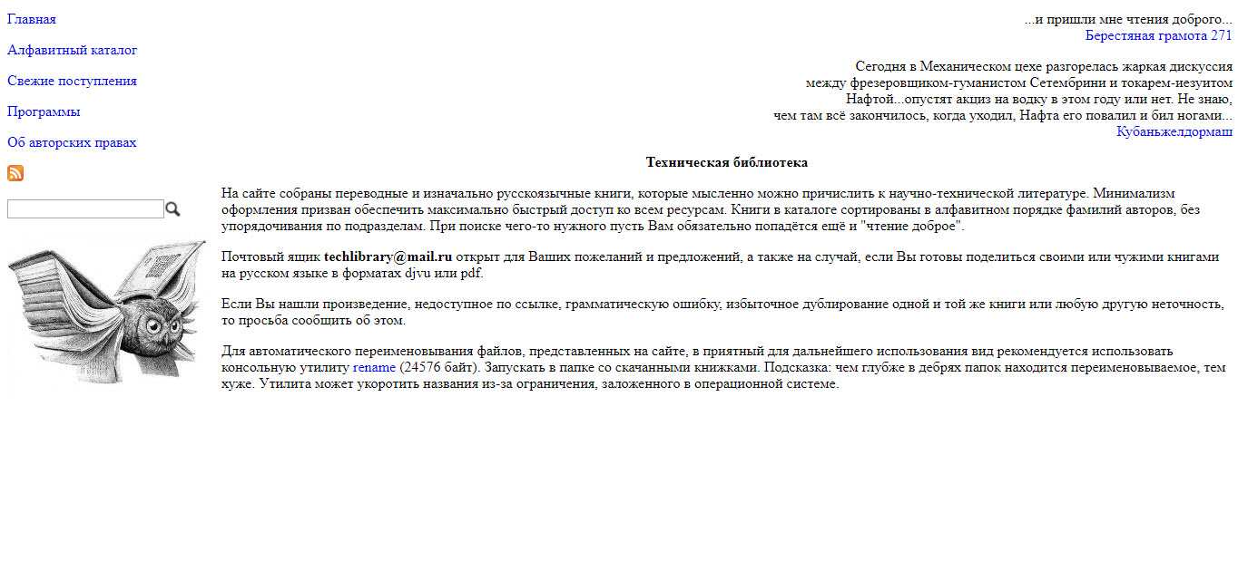 Этот ресурс предлагает своим посетителям массу разноплановой литературы, так или иначе касающейся техники или науки. По прямой ссылке можно скачать на свое устройство энциклопедию, учебник, методичку, технический справочник и многое другое. Темы охватывают широчайший спектр: