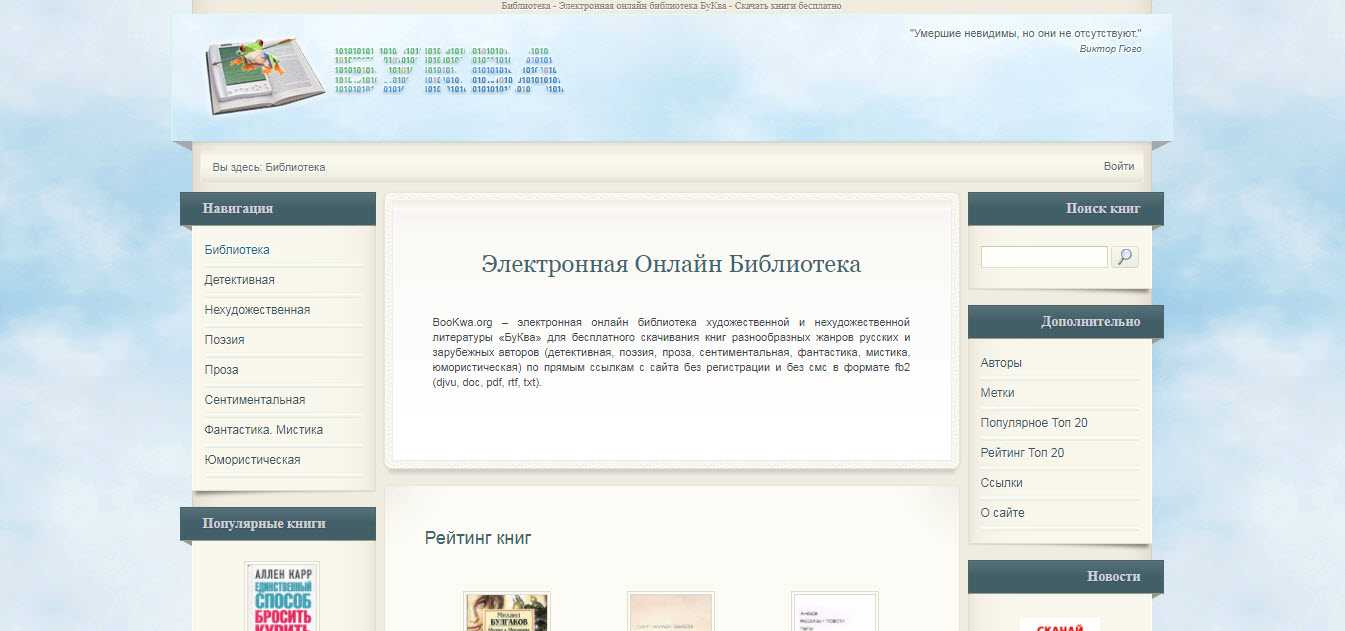 Электронная библиотека, которая насчитывает в своем архиве около 200 000 электронных книг. Регистрации на данном ресурсе нет, поэтому гость сайта может без проблем скачать интересующую его книгу. Вопрос состоит только в том, есть ли нужная книга на Bookscafe.net. Современные мировые бестселлеры вы не найдете, зато отечественную и мировую классику без проблем.