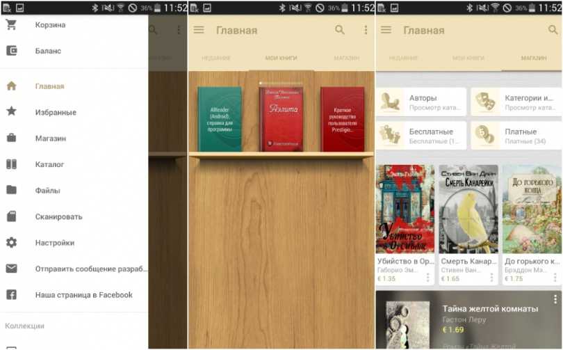Ещё одно достойное приложение для чтения, с хорошими возможностями. После регистрации вашего PrestigioID вы получаете доступ к магазину книг, где отдельной графой выделены бесплатные, а кроме этого – синхронизацию между вашими андроид-устройствами, с одинаковыми PrestigioID. Также можно читать и книги не из магазина приложения, а загруженные в память устройства в форматах epub, pdf, html, fb2, fb2.zip, rtf, txt, epub3, Adobe DRM epub. Приложение имеет все необходимые настройки для чтения, не такие гибкие как у Moon+ Reader, но их вполне достаточно, для комфортного пользования программой. Очень удобно, что, в отличие от Bookmate, бесплатные книги не надо искать – они уже удобно собраны в отдельном разделе. Минус приложения только один – оно доступно только на Android.