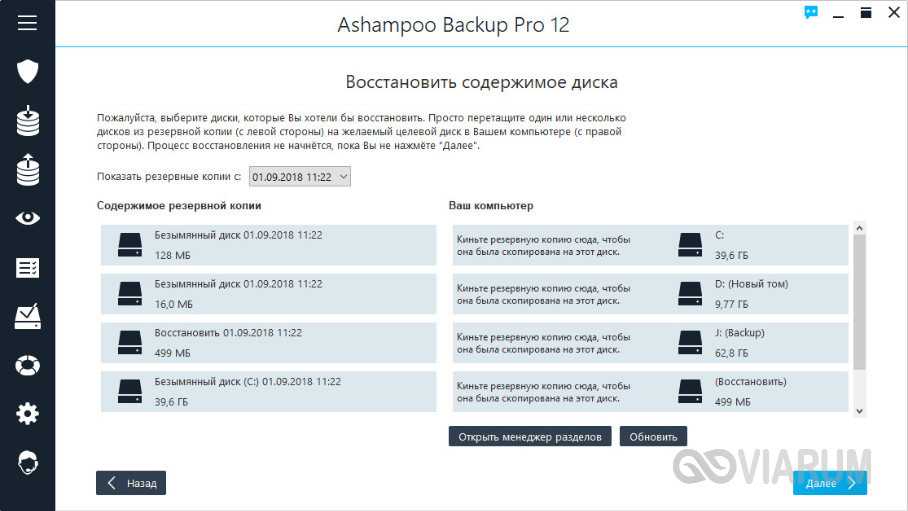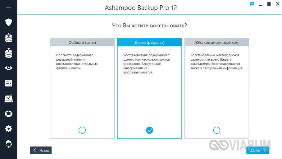 Восстановление в Ashampoo Backup Pro реализовано на наш взгляд не совсем удачно. При выборе режима восстановления «Разделы» загрузочная информация не восстанавливается, приходится либо выбирать разделы вручную, либо восстанавливать целый жесткий диск. Второй вариант не всегда приемлем и не всегда доступен (на ПК с одним диском), при выборе же первого у пользователя могут возникнуть трудности с идентификацией нужного раздела. Следует также сказать, что восстановление основного системного тома возможно только из-под загрузочного носителя.