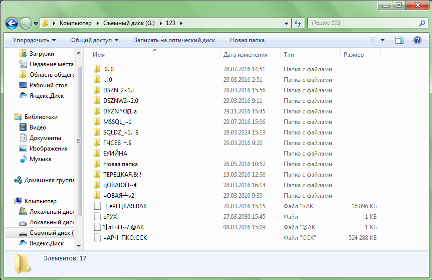 Итак, у нас имеется флешка, на которой находится папка, содержащая папки с непонятными именами. Эти папки не удаляются.