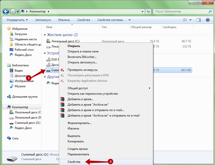 - Перейдите в Компьютер и вызовите контекстное меню, щелкнув правой кнопкой мыши по нужному носителю (1), затем нажмите «Свойства» (2).