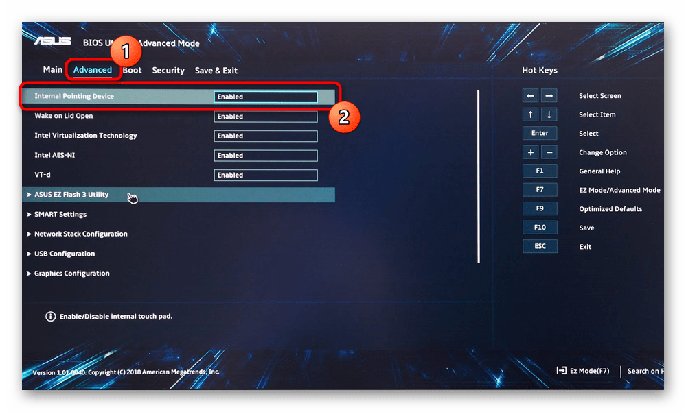 - Тачпад может не работать из-за отключения в БИОС. Зайдите в него (клавиша delete или F2 сразу при включении компьютера). Перейдите в раздел «Advanced». Найдите в нем «Internal Pointing Device» и проверьте, что опция включена (значение «Enabled»).