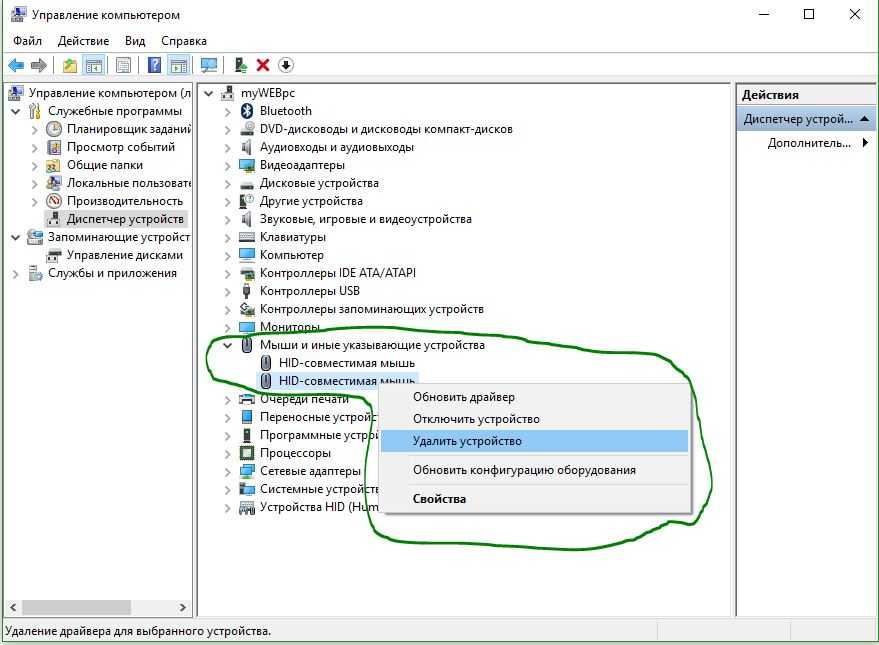 Найдите раздел «Мыши» и раскройте его. Кликните по устройству тачпада правой кнопкой мыши и удалите егоПерезагрузите компьютер. Система обнаружит новое устройство и переустановит драйвер.