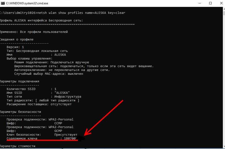 В результате выполнения этой команды в командной строке получаем всю необходимую информацию, в том числе и пароль от указанной Wi-Fi сети.