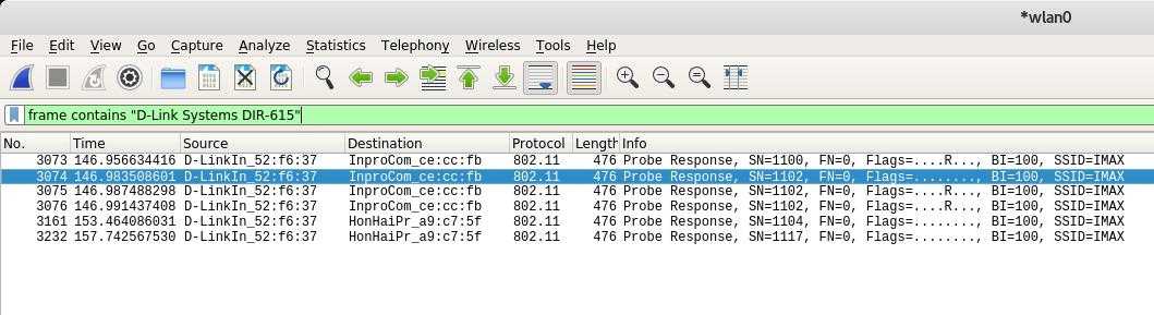 Я несколько минут захватывал фреймы Wi-Fi, а затем стал искать по фильтрам, начал с фильтра frame contains «». Для ТД D-Link Systems DIR-615 раскрывалась модель роутера, поэтому я присмотрелся к фреймам, содержащим этот текст: