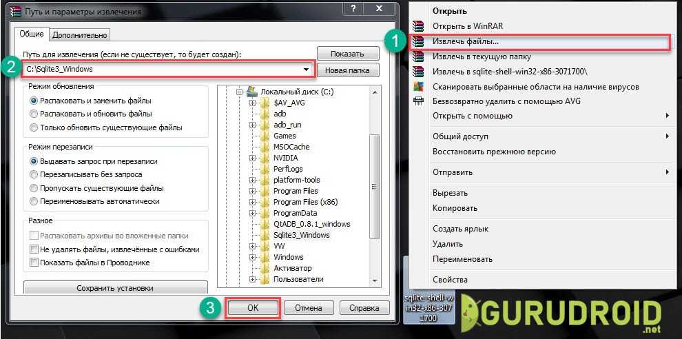 В неё нужно будет распаковать архив «Sqlite3.zip», который предварительно загружается на компьютер. Как и в предыдущем случае, кликаем по файлу правой кнопкой мыши, затем выбираем «Извлечь файлы», указываем путь и запускаем процесс клавишей «Ок».