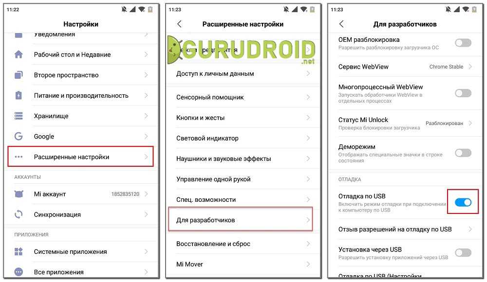 Меню -> Настройки -> О телефоне-> Версия MIUI и нажмите по нему примерно 7 — 10 раз, после чего вернитесь в Настройки -> Дополнительно -> Для Разработчиков -> Отладка по USB — поставить галочку.