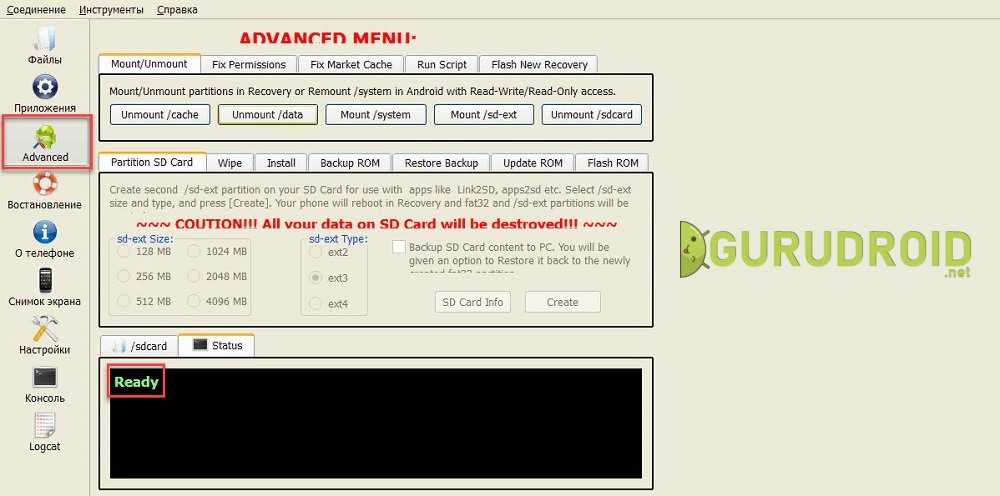 В приложении нажимаем по вкладке «Advanced» и убеждаемся в том, что монтирование раздела /data завершено успешно.