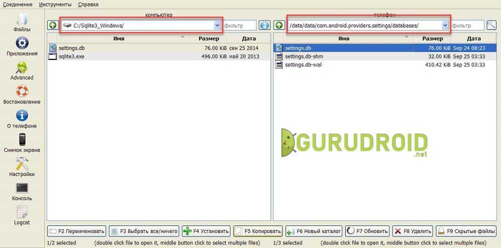 Теперь нажимаем по кнопке «Файлы» и в левой части программы открываем папку «Sqlite3_Windows», а в правой соответственно – «/data/data/com.android.providers.settings/databases/». Далее перемещаем объект «settings.db» из памяти смартфона на компьютер.