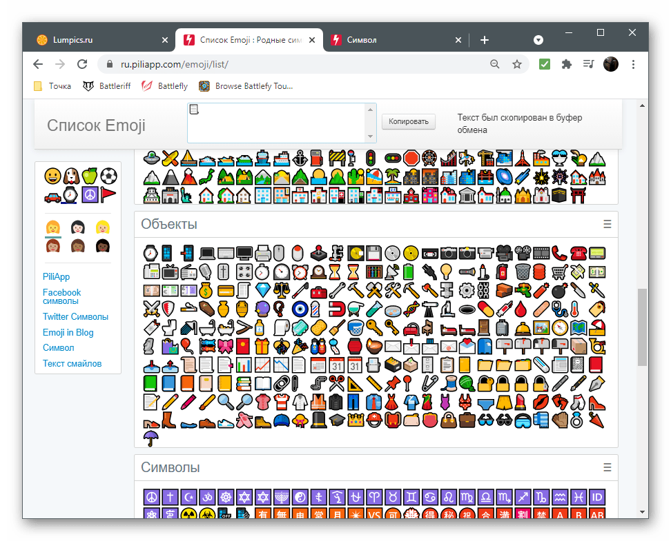 Точно так же используются и эмодзи, о которых мы уже говорили выше. Найдите подходящие на сайте и скопируйте их.