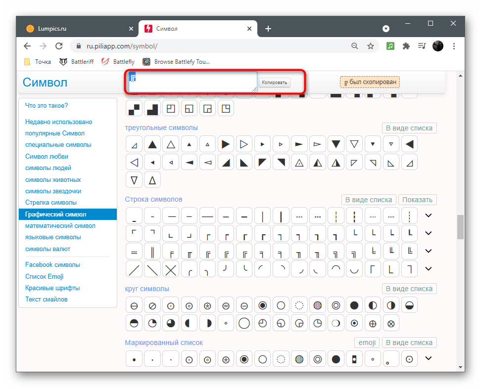 Все символы добавляются в поле вверху, после чего их можно будет скопировать разом.