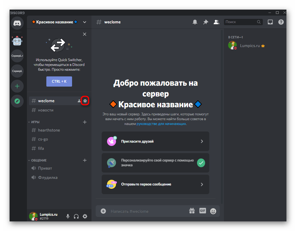 - Наведите курсор на необходимый канал и щелкните по значку с шестеренкой.