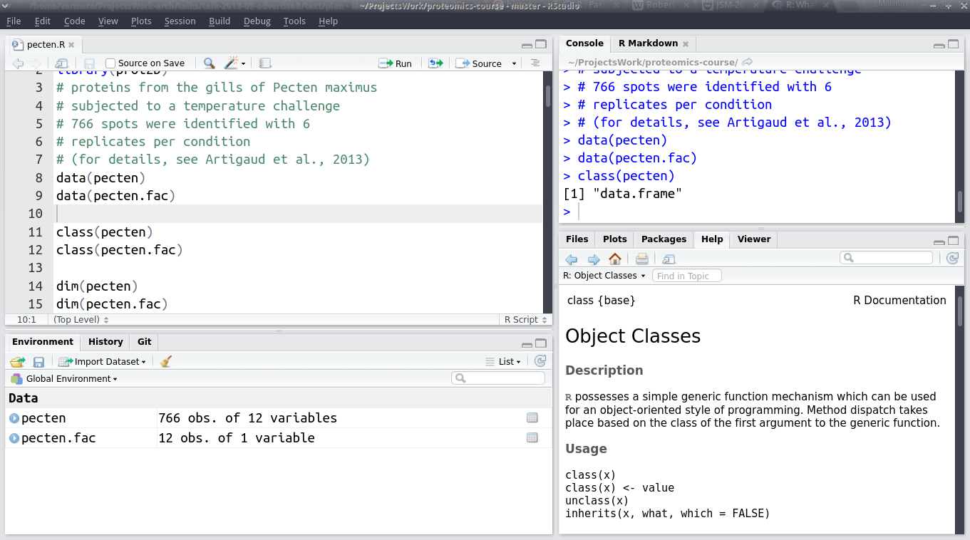 - среда/история (и еще может быть /Git, если ваш проект под контролем версий) (синий прямоугольник на схеме). На вкладке история есть список всех выполненных команд R. На вкладке среда расположен список объектов, находящихся в памяти.