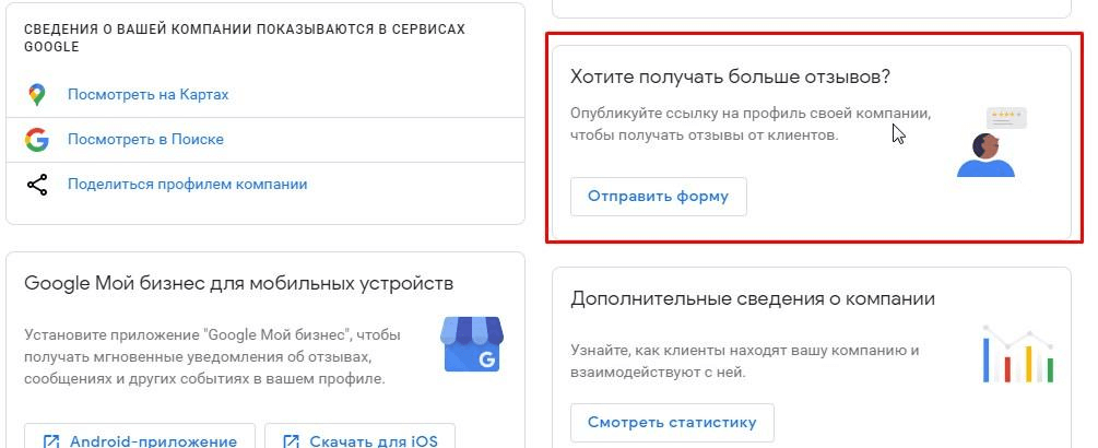 У Google это ссылка на сбор отзывов, которую можно найти в Google Мой бизнес. Она ведет на карточку организации на Google Maps, сразу в раздел отзывов. Разместив ее в соцсетях, рассылке, на сайте, можно побудить клиентов оставить больше отзывов.