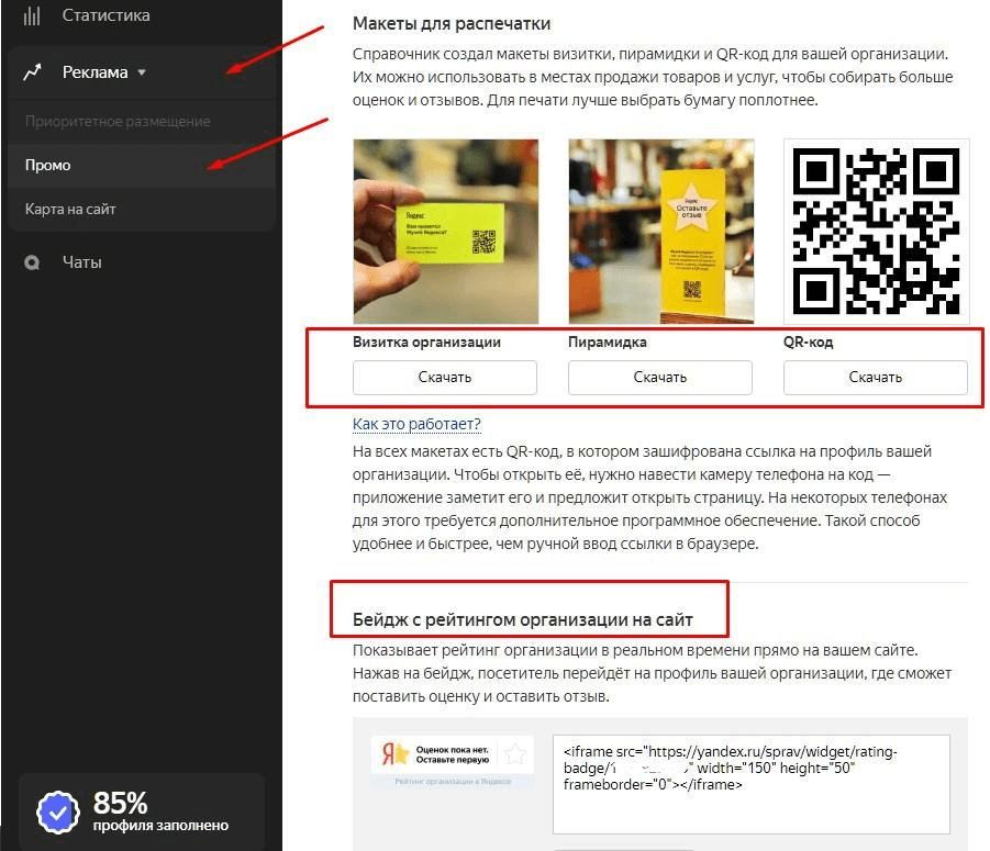 У Яндекса это печатные промоматериалы (визитка, пирамидка и QR-код отдельно) и виджет на сайте с рейтингом.