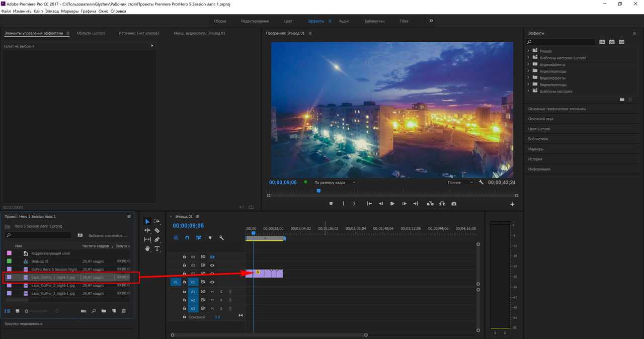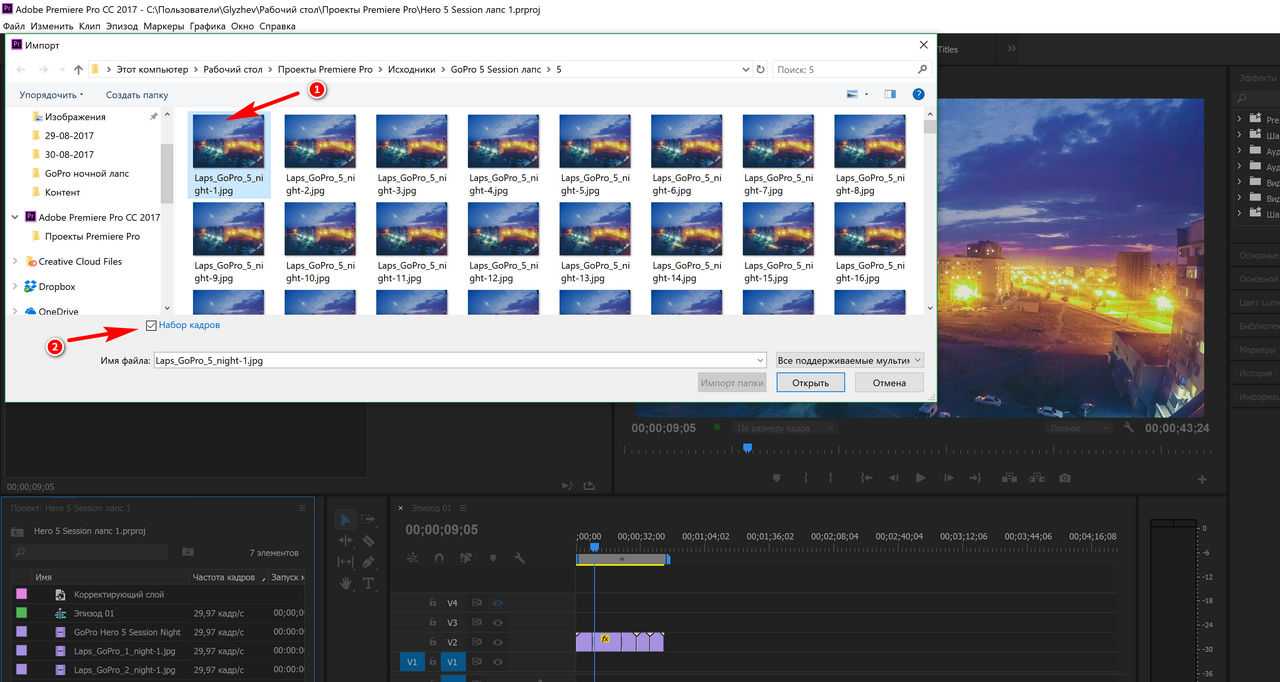 Итак, открываем Premiere Pro, где создаем новый проект и новый эпизод. В настройках эпизода выберем 1080P 25 или 30 кадров в секунду. Теперь импортируем ранее полученные кадры сразу, создав фильм из них. Для этого достаточно открыть папку с файлами, выбрать первый и поставить галочку на «Набор кадров».