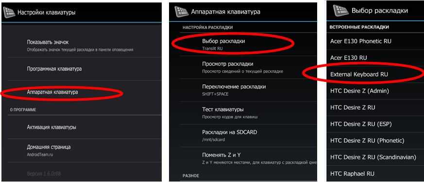 Для начала заходим в появившееся в системе при установке Russian Keyboard приложение “Настройки клавиатуры”, выбираем в нем пункт “Аппаратная клавиатура”, а в нем “Выбор раскладки”. По умолчанию там стоит “Translit”, его нужно сменить на “External Keyboard (RU)”.
