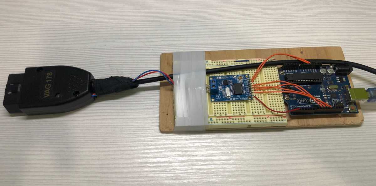 На основе Arduino Uno и модуля TJA1050 Niren с CAN-контроллером MCP2515 я собрал сниффер, который подключается в любое место в шине CAN и слушает пролетающий трафик. При этом сниффер никак не мешает работе систем. Чтобы подслушать, что отправляет VCDS, нужно подпаяться в сам диагностический кабель к пинам CAN-High и CAN-Low.