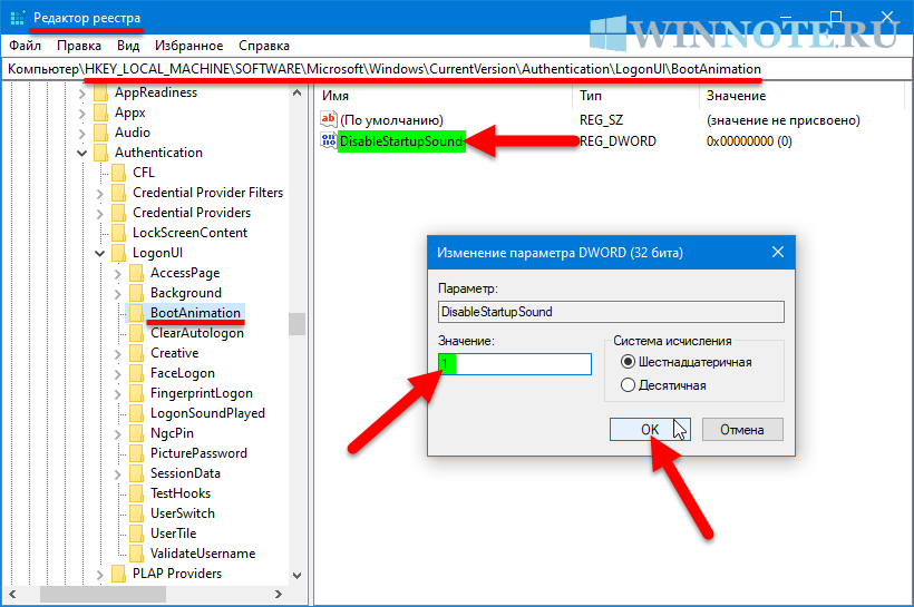 Чтобы отключить мелодию запуска Windows, установите для параметра DisableStartupSound значение 1 и нажмите кнопку OK.
