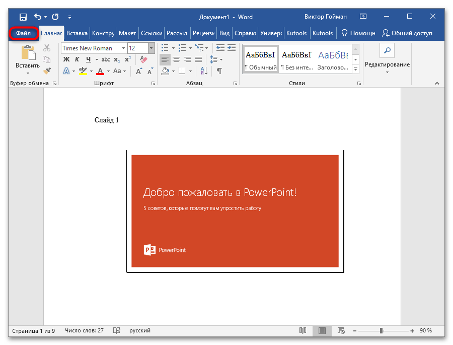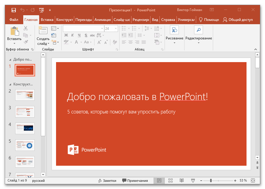 - Откройте презентацию, которую нужно конвертировать в формат DOCX. Для примера опять воспользуемся стандартным шаблоном PowerPoint, демонстрирующим возможности программы.