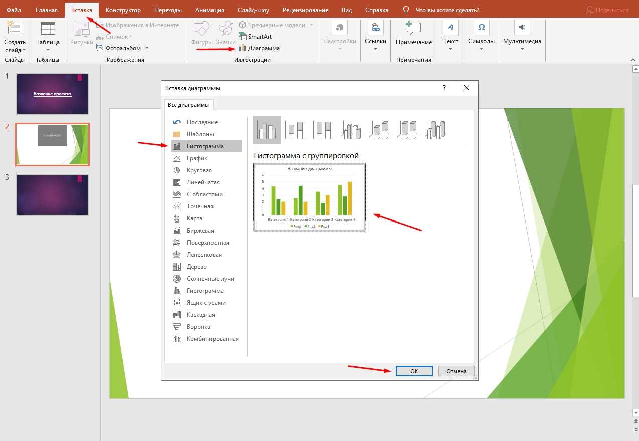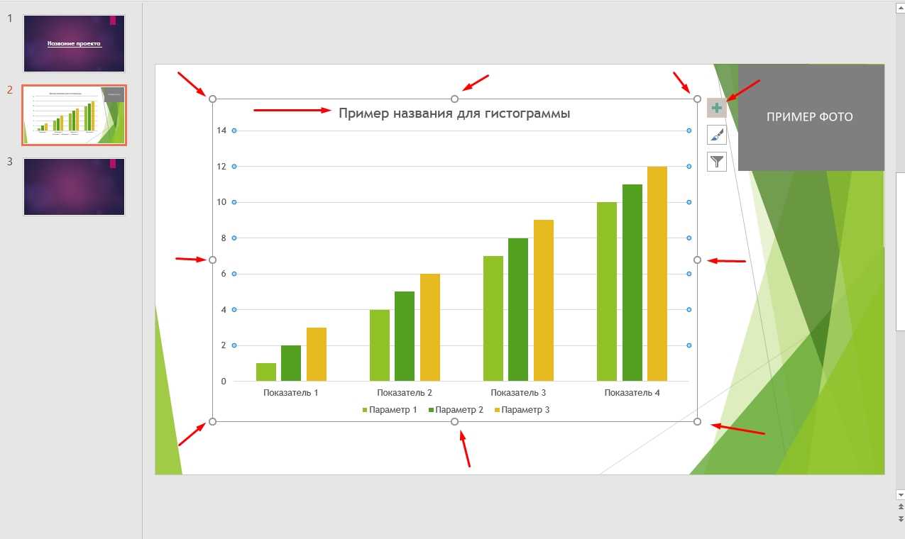 Внеся информацию в специальное окно, вы можете закрывать его. На слайде будет отображена гистограмма, которую останется настроить. Если быть точнее, вам необходимо проработать вопрос расположения элемента. Изменяйте размер различного содержимого, чтобы всё грамотно уместилось на слайде. Если какие-то изображения накладываются друг на друга, уменьшите их, если это возможно. Для гистограммы впишите название. При желании можно кликнуть на кнопку в виде плюса и выполнить ещё более детальную настройку.