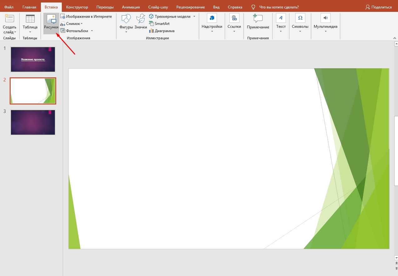 - Перейдите во вкладку «Вставка», предварительно открыв тот слайд, куда необходимо добавить объект.