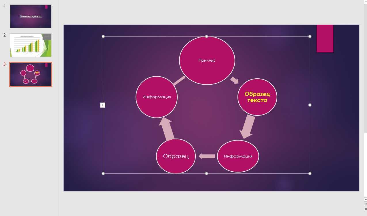 На слайде отобразится схема, которая настраивается любым способом. Например, вы можете изменить размер, определить расположение и так далее. Все элементы поддаются редактированию, что очень удобно. Кликайте по тем компонентам, где должен находиться текст. Когда появится курсор, начинайте вводить содержимое.