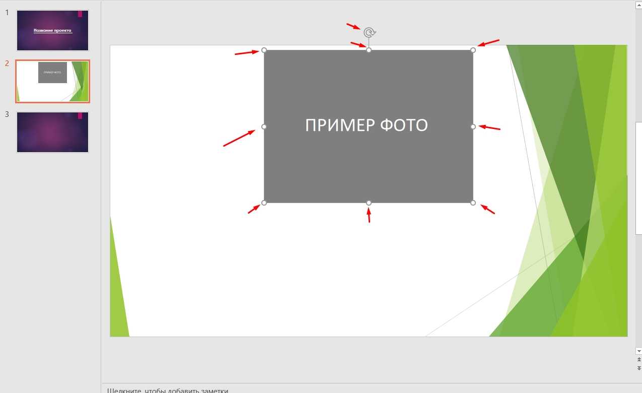 - На слайде отобразится фотография, с которой можно работать. По периметру есть специальные маркеры, с их помощью реализуется изменение размера и ориентации элемента. Кроме того, вы можете любым образом перемещать картинку по слайду.