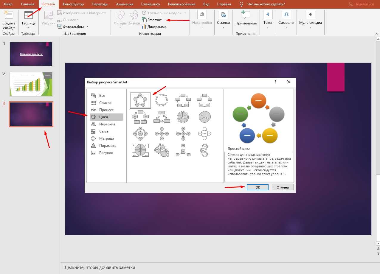 Естественно, существует множество объектов, которые можно добавить в проект и сделать его более привлекательным и удобным для восприятия. В рамках данной инструкции о том, как сделать презентацию в Повер Поинт, будет описан момент с добавлением специальных схем. Они представляют собой готовые шаблоны, которые нужно лишь заполнить. Инструкция выглядит следующим образом: