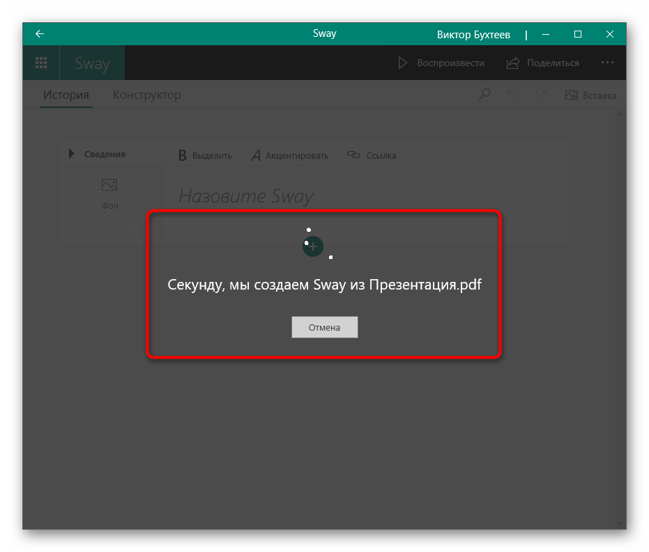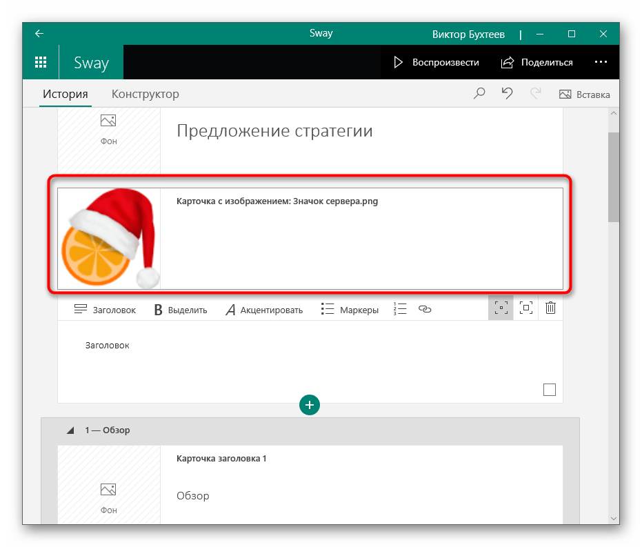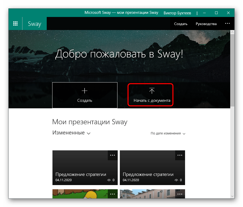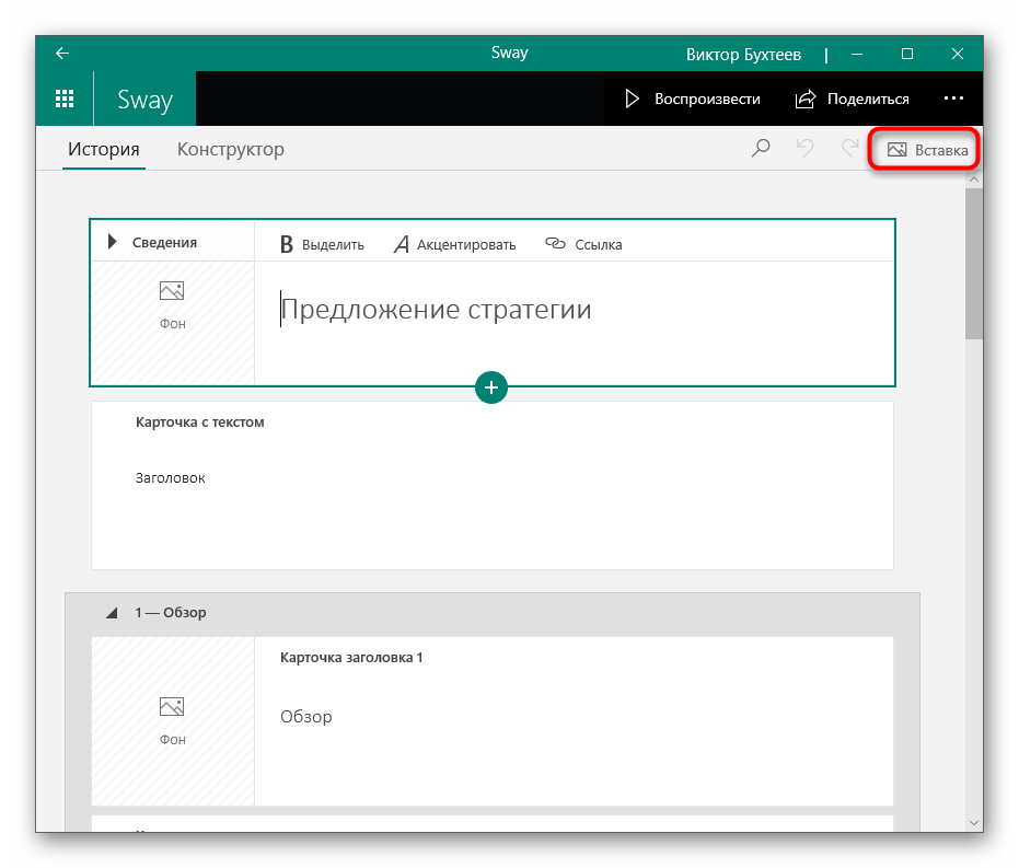 Некоторые презентации создаются в формате Word или PDF и тоже требуют вставки изображений. В таком случае подойдет бесплатное решение от компании Microsoft под названием Sway. В нем есть все необходимые функции, чтобы начать работу со слайдами и сделать их оформление уникальным, расположив фотографии в нужных местах.