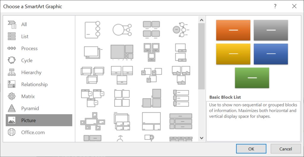 - Выберите вариант, который вам больше всего нравится. Когда вы наводите указатель мыши на различные параметры, вы увидите, как выглядит ваш текст, преобразованный в этот параметр SmartArt.