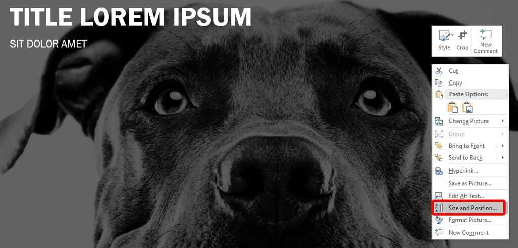 - Щелкните изображение правой кнопкой мыши и выберите «Размер и положение».