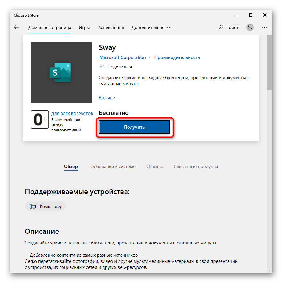 - Воспользуйтесь ссылкой выше или откройте Microsoft Store в Windows 10, чтобы установить Sway на свой компьютер.