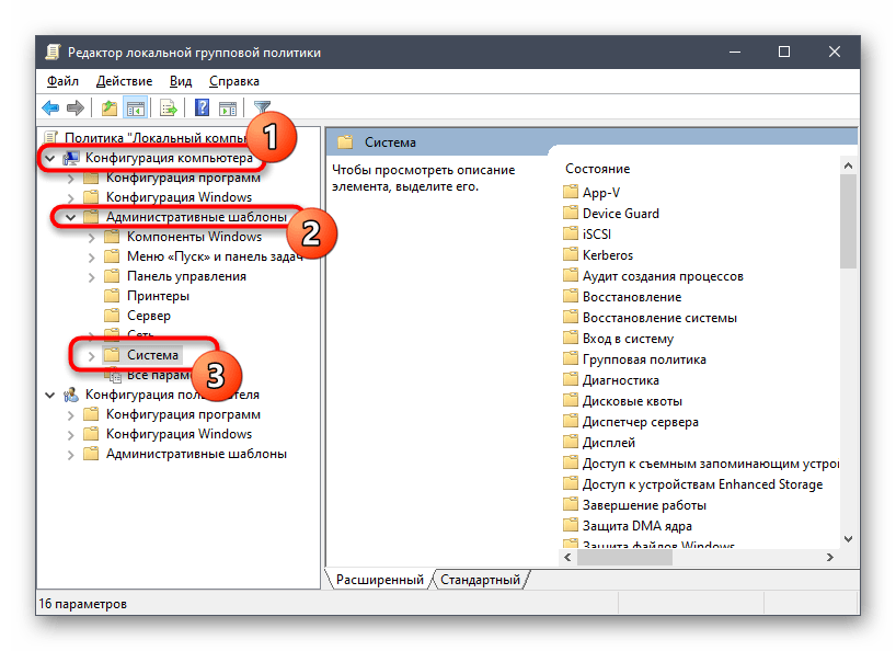 Воспользуйтесь левой панелью, чтобы перейти по пути «Конфигурация компьютера» — «Административные шаблоны» — «Система».