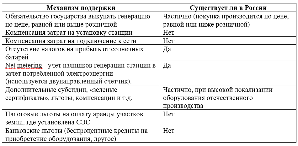 К сожалению, пока в России только частично введены меры государственной поддержки для объектов альтернативной энергетики. Перечислим таковые в других странах и отметим, какие из них введены в РФ полностью или частично.