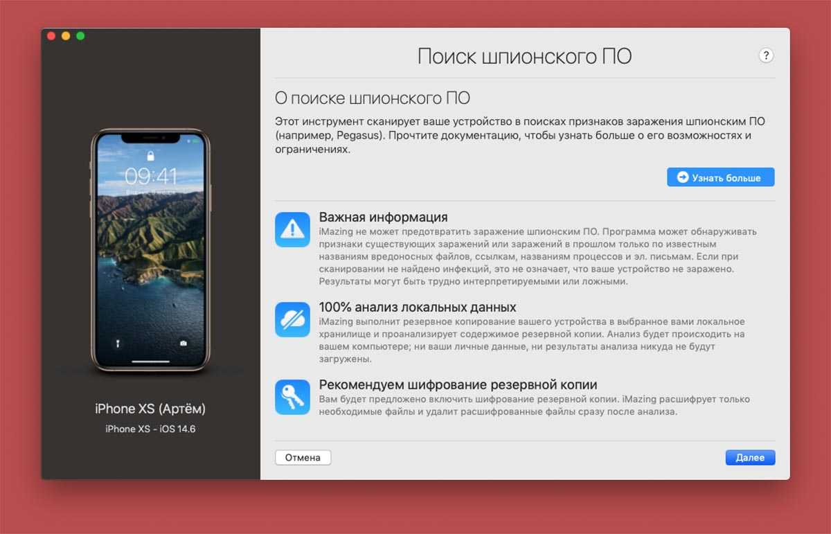К счастью, на помощь пришли разработчики давно известного стороннего файлового менеджера для iPhone – iMazing. В обновлении 2.14 они добавили возможность сканирования iPhone или iPad для обнаружения вируса Pegasus или другого ПО на его основе.