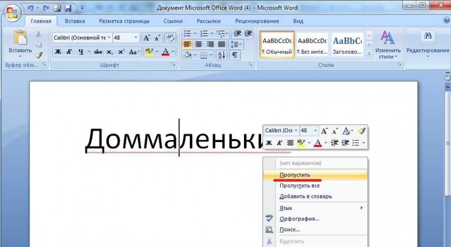 Первый этап. Откроем новый лист, на котором напишем два слова, без пробела: доммаленький. При этом ворд подчеркнет слово красным цветом, выделим это слово, нажмем на правую кнопку мыши и в появившемся меню нажмем на строчку «пропустить», чтобы красная полоса пропала.
