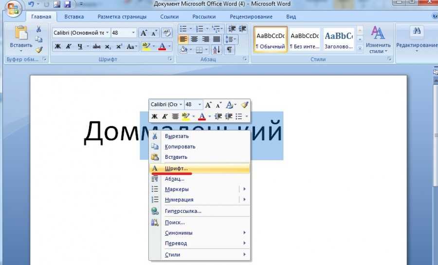 2) Нажать правой кнопкой мыши по выделенному фрагменту и выбрать в выпадающем окне пункт «Шрифт».