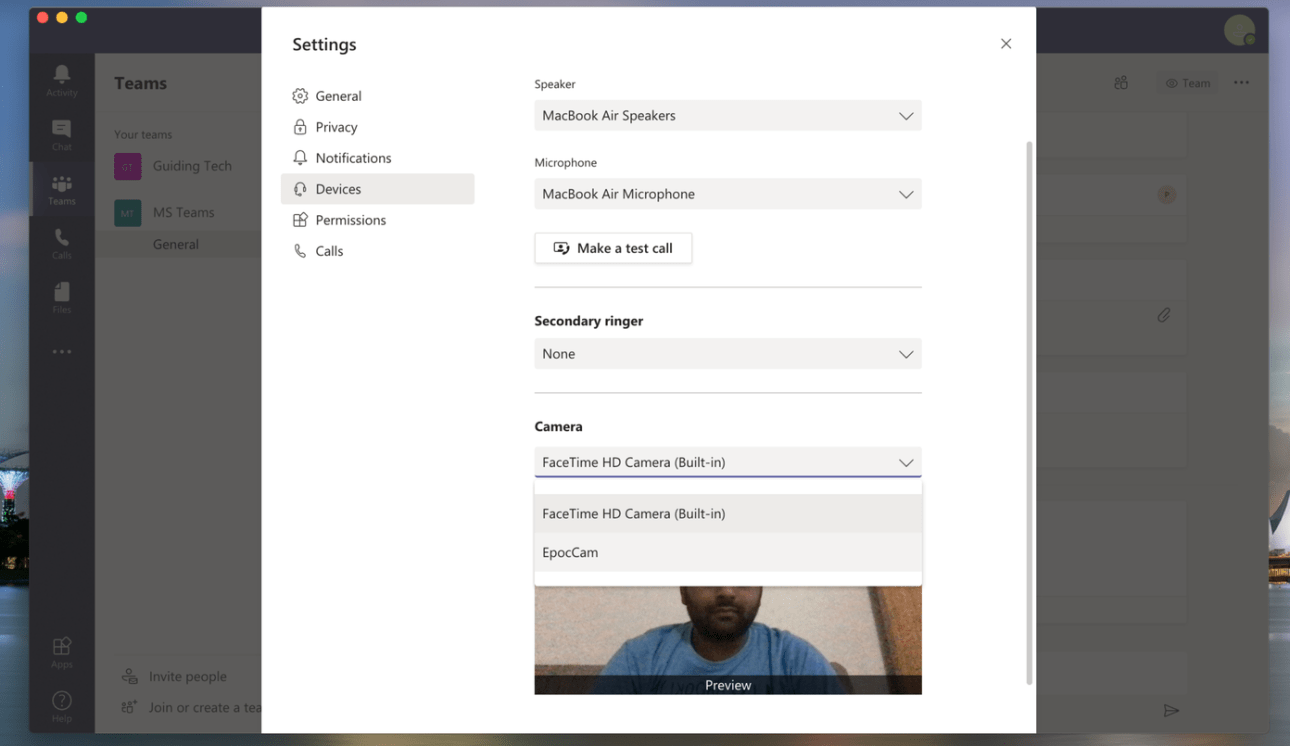 Для Microsoft Teams откройте приложение Teams на Mac / ПК, нажмите значок профиля вверху и перейдите в «Настройки». Перейдите в меню «Устройства» и выберите «Сервисы Kinoni Audio» в меню микрофона. В том же меню выберите EpocCam в качестве видеокамеры по умолчанию в Microsoft Teams.