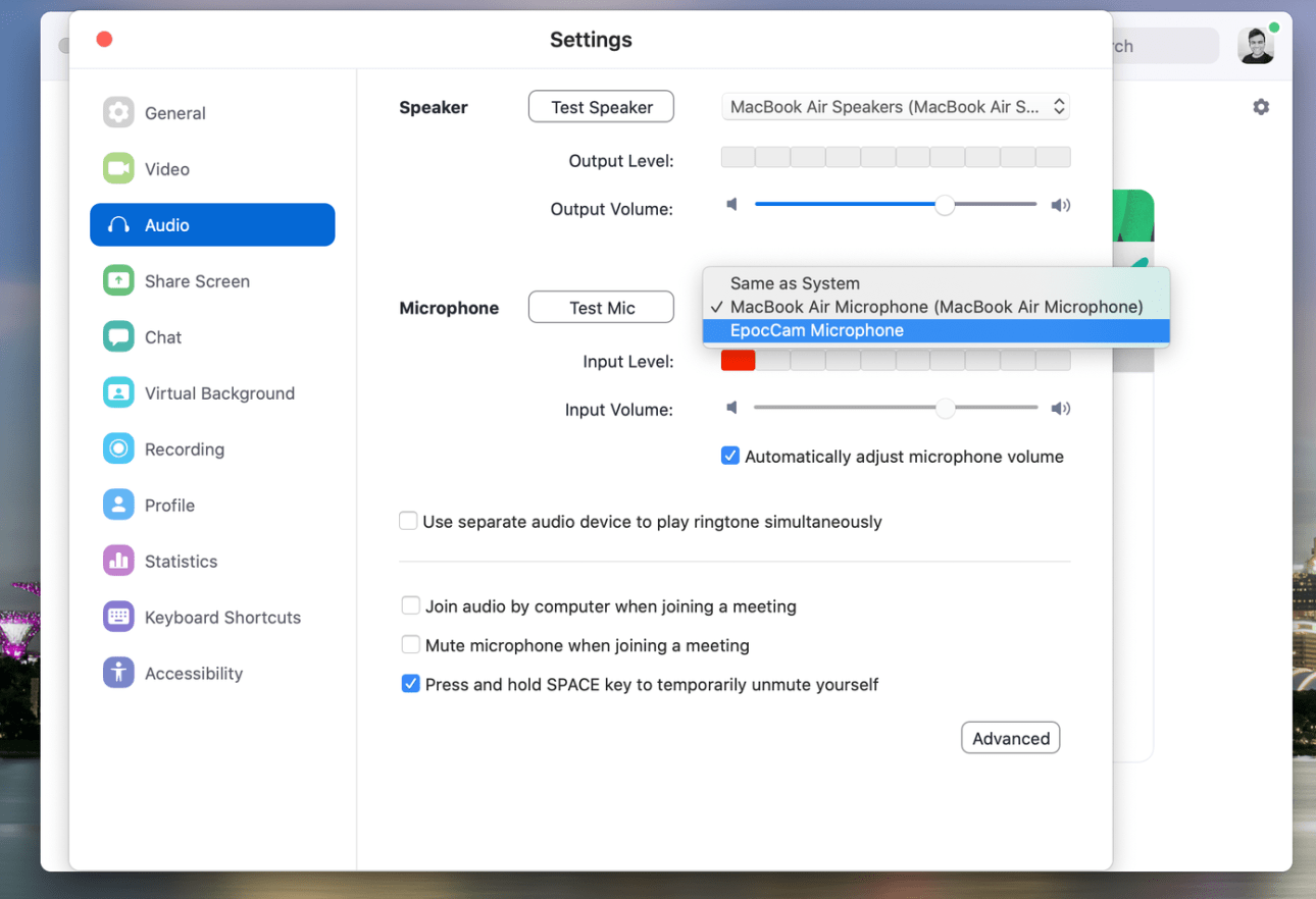 Шаг 3: Перейдите к аудио и установите микрофон по умолчанию на EpocCam.