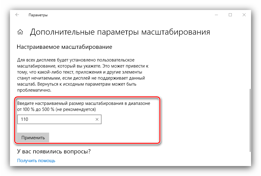 В меню «Дополнительные параметры масштабирования» также присутствует инструмент, позволяющий вручную задать масштаб. О том, как перейти в указанное выше меню, читайте в первой инструкции. В этом окне вам нужно лишь опуститься немного ниже и выставить значение равное 100%.